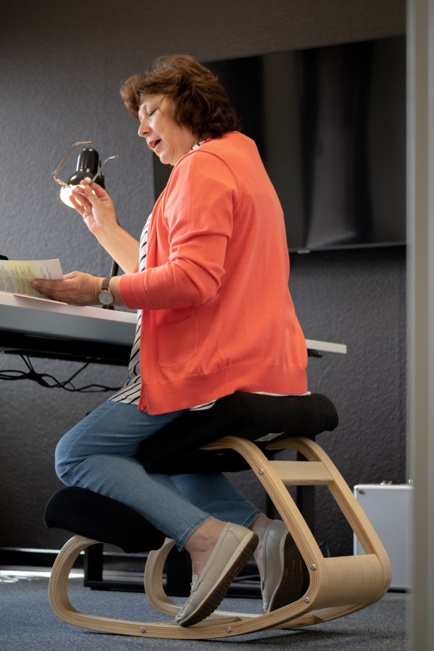 When you sit in a conventional chair, your pelvis rotates backward, flattening the lumbar curve and stressing the lower back. The principle of a kneeling chair is different:
