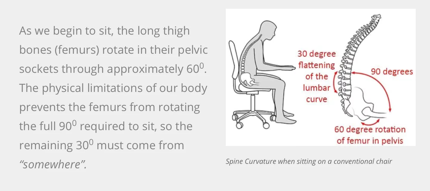By opening the pelvis and lowering the knees in relation to the hips to create a 120° back-thigh angle, the disc pressure in the lumbar region of the spine is reduced by up to 65%when compared to sitting in the traditional 90° back-thigh angle position.